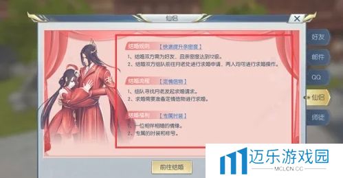 3、在仙侣页面可以看到关于结婚的规则、流程和福利,需要满足亲密度12级前往月老处进行操作;