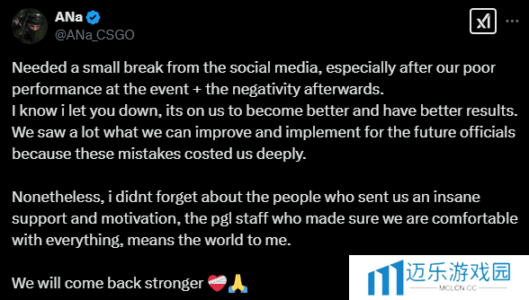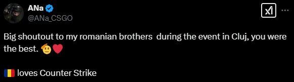 “在PGL 克卢日-纳波卡赛事期间,向罗马尼亚的兄弟们致敬,你们是最棒的!罗马尼亚如此热爱CS。”