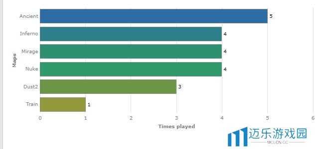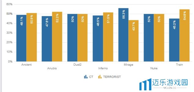 Mirage在CT方胜率高达56.3%,而Train的T方胜率也来到了54.8%。Dust2和Nuke在地图出场次数接近的情况下,双方胜率均为50%。