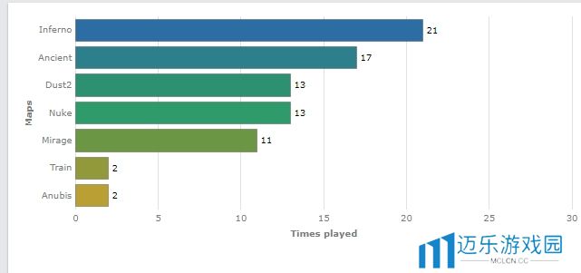 本次PGL 克卢日-纳波卡站小组赛中最受欢迎的地图是Inferno,出场了21次,Ancient 17次位列第二。出场次数最少的是Train和Anubis。
