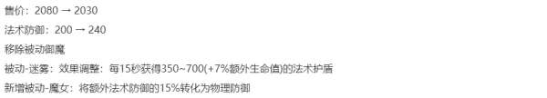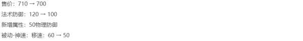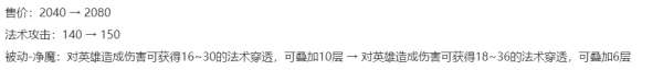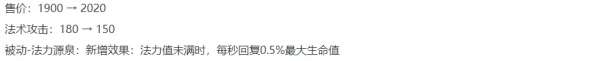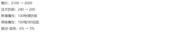 而其中的代价,则是魔抗低了40点,被动的回血增幅则少了1%,就连每5秒回100血量的基础属性也被移除了。