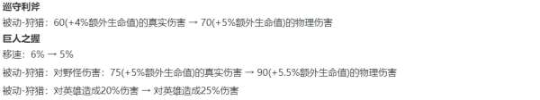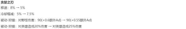 主要是被动伤害从真伤改为物伤,同时,三级肉刀对英雄的转化伤害也会提升5%,移速则会下降1%。