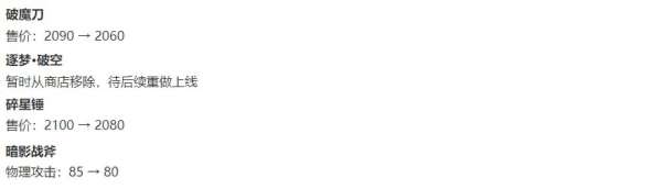 【解读】还有破魔刀+逐梦·破空+碎星锤+暗影战斧,在数值或者价格上也有微调,其中,逐梦·破空也会直接删除,等后续重做后才会再次上线。