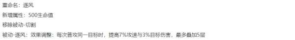 【解读】铸梦·逐风会彻底改名为逐风,不仅新增了500点血量,被动还改为了普攻增加7%攻速+3%伤害,最多5层。