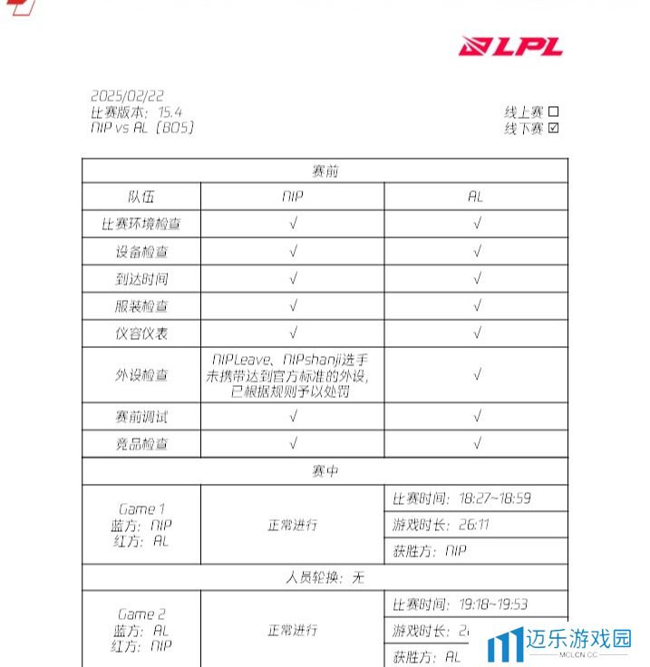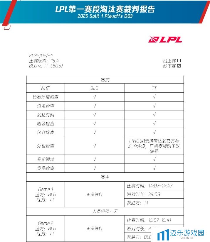 LPL赛事官网公告更新LPL第一赛段淘汰赛裁判报告,Hoya、369、Leave、shanji、Missing五名选手在比赛的外设检查环节,未携带达到官方标准的外设,已根据规则予以处罚。
