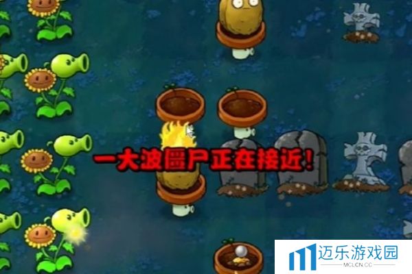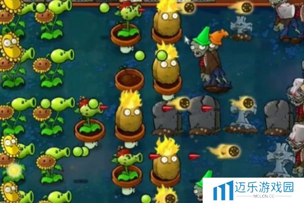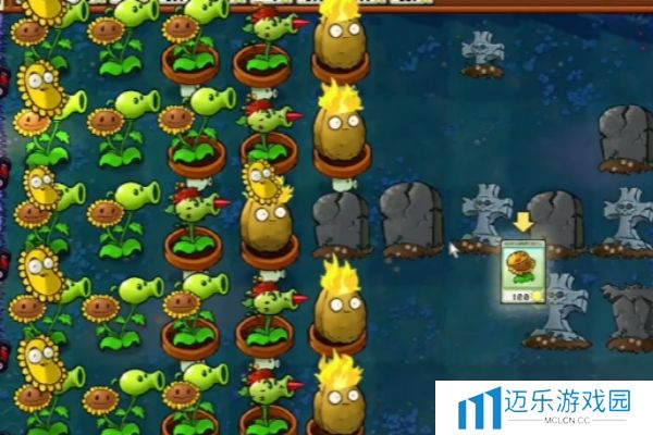 2、在种植一些豌豆向日葵后,再选择小盆菇,种植上火炬坚果和土豆雷。