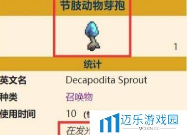 2、其次就是这个节肢动物芽孢,它是一个在困难模式之前可以合成的一个召唤物,如果想要合成它,那么就需要收集50发光蘑菇,然后来到恶魔祭坛或猩红祭坛进行制作即可获得。