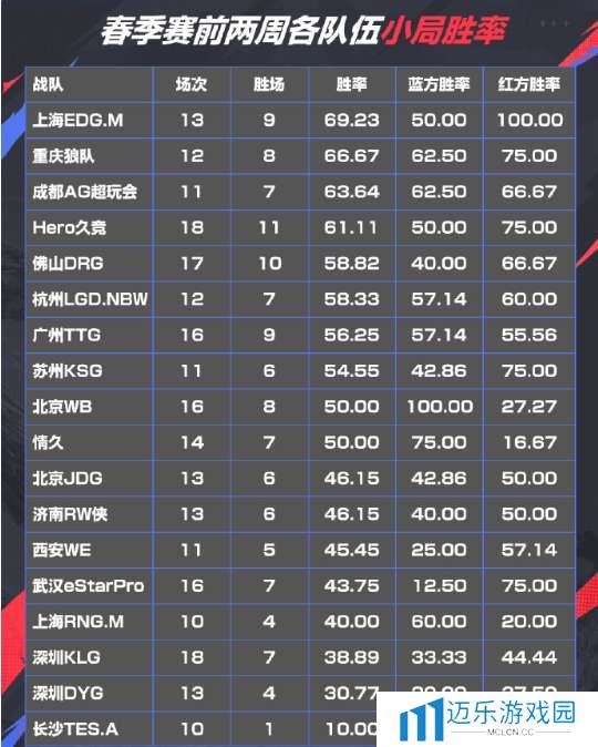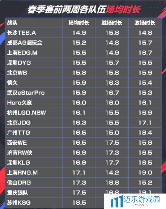 春季赛前两周各队伍小局时长和小局胜率出炉
