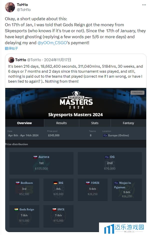 在未收到这项于2024年4月就已经结束的赛事奖金后,ToH1o再次在社交平台上披露了更多细节。据ToH1o称,Gods Reign战队一直在拖延支付他和yoom的奖金。