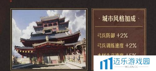 在重返帝国开局的时候,玩家要自主选择城市风格去建设自己的基地,这里的城市风格有中式、罗马式、法兰克式、拜占庭式四种,不同的城市风格所具备的加成效果是不一样的,比如中式风格中可以为弓兵防御+2%、弓兵训练速度+2%以及木材生产速度+5%,玩家可以根据自己想要发展的兵种去进行选择。