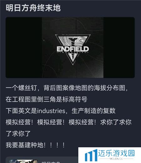 从图片来看,正中间应该是一个螺丝钉,它背后的图案有点像高中地理里学过的地图海拔分布图,在工程图里倒三角是标高符号。EndField下面的英文是industries,是生产制造的复数意思,再结合最近YJ在招模拟经营的策划,这个新游戏是模拟经营类型的可能性很高很高。
