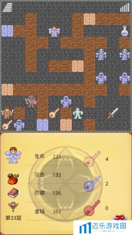 END一区(1-10层)打法此区不用商店,找出拿宝石的最好顺序是重点。1楼杀到3楼进一段剧情,被抓住扔牢里之后生命400,攻击10,防御10。回3楼拿完钥匙,一直杀上5楼,撞开暗墙取剑。拿完剑向上开黄门打一小绿一小红拿钥匙。攻防20/10重要!现在向上冲会受到蝙蝠的大量伤害。而只要加1点攻击达到21攻击就能少受蝙蝠的一次攻击,使得伤害从56减少到28,直接减半。回4楼,开下侧右边门打一法师拿宝石,血瓶暂时不拿。打左下房间蝙蝠和1小绿拿钥匙。(沿途用最低的血量消耗拿了大量钥匙,到8层正好可以用完,就不用打麻烦的骷髅了)5层小蝙蝠杀光拿走钥匙,杀上6层。6层左半边从中间杀过,开1黄门拿走左上4黄钥匙。右半边因为是骷髅,开3黄门绕过去。7层打下侧小蝙蝠拿2黄钥匙,开3黄门绕骷髅。上8层之前确认手里有3黄钥匙,不够的话说明门开多了需要重打。8楼向右开3黄门拿走钥匙。9楼向右打小绿,撞暗墙拿盾。拿完向左杀怪拿走1红1蓝两个宝石。此时攻防22/21然后按以下顺序收集宝石。钥匙不够可以考虑7楼右上的骷髅(23攻以上最划算)。7层红宝石、6层蓝宝石、3层蓝宝石8层红蓝宝石、1层红蓝宝石。攻防25/253层红宝石,达到26攻击,骷髅士兵攻击次数最低。拿走5层蓝宝石,9层开蓝门上10层,拿走红蓝宝石。需要至少4把黄钥匙,暂时不要开右下的血瓶。攻防27/27,宝石拿满。8层杀两个卫兵拿红钥匙。需要380血。吃血瓶直到血量达到634以上多一点点(以下简称为准备多少血),10层决战。决战之后吃掉所有奖励,攻防30/30。END二区(11-20层)打法二区·前篇(11-17)从小偷嘴里知道剑在17层,盾在11层。任务一:拿装备打小蝙蝠一路上到12楼,加2次攻击1次防御。38/3813层直接过。那是神圣剑,现在拿不到。14层中间那个突出的黄门下方是暗墙,撞开上楼。15层准备5黄1蓝。11层向左打小黑拿5黄,15层花200买蓝钥匙。准备好钥匙之后从章鱼右边的走廊杀到小偷门前,剧情开路。16层绕开中间怪物到左下房间,打掉小黑向上撞暗墙拿走东西,上17层打掉左边4个初级卫兵拿剑。60/40下楼到6层,买右上的钥匙,开11层蓝门,准备约330血拼掉高级法师。懒得凑血直接吃里面的400血也是可以的。任务二:扫一区此时攻防60/60,一区所有怪无伤,小黑无伤。拿走1-10层所有钥匙,血瓶尽量留。注意钥匙剩余量,能不开的门不开。1层飞行器拿到之后就可以站在楼梯口飞行了。二区·后篇(17-20)任务三:杀过17层以现在60的攻击力,17层守门的高级法师砍你三刀。被砍两刀需要攻击是64,所以目标是11 12层的红宝石。因为中间要被好多怪砍掉血,先拿15层左上的蓝宝石。按顺序先拿12层后拿11层,此时64/64,17层走蓝门杀上18层。18层上去向下撞暗墙,然后开右边门打法师补钥匙。准备320血强杀兽人武士上楼。此处上方的蓝门不开,否则后期蓝钥匙不够。19层从左边打蝙蝠小黑开路上20层。任务四:秒大蝙蝠大蝙蝠攻击高达100,然而血低皮脆,只需要68攻击即可秒杀。20层左边拿走宝石,右边暂时不动。开18层中间蓝门拿走18层左下的红宝石,右边不动。此时攻击68,秒大蝙蝠。任务五:决战BossBoss吸血鬼血量444攻击199防御66,没有十字架基本不可能强杀。打掉15层左边挡路的怪(墙中间的黄门不开),拿走蓝钥匙。19层杀到右边拿红宝石,钥匙不够16层左上角可以补两把,此时攻防70/66,准备310血强打中间房间石头人,撞开中间暗墙拿走十字架。此时考虑现在的损伤,目前剩下的所有宝石都不值得拿。后期再说。缺一把红钥匙,准备330血杀14层左上角3兽人武士爆红钥匙。12层左上钥匙舍弃不买。12层右上角是摆设,不用去了。准备670血,一二区血瓶肯定够了。决战之后吃掉所有奖励。攻防76/72,二区尚有1块红宝石3块蓝宝石未取。END三区(21-40层)打法三区·前篇(21-35)此路线为了提高容错率,加防到120之后清理前两区残怪。一般50层要尽量留下怪物,为了多留金币。但经过实测,就算打掉前两区剩下的怪,四区第一时间拿到,钱已经足够加到19次属性正常通关,而在三区一开始就加足属性能省下很多血。任务一:游览21-30层21-22层直接过。23层撞出Go 0F字样(注意G的最后一横),一直上楼上到29层,和小偷对话开暗道,打掉30层一群球球过。注意如果29层不给你开一定是23层墙没撞完,回去检查。任务二:清扫前两区二区小怪攻击最高120(16层右下的幽灵不着急杀),所以先开商店。31层杀上去,32层杀鬼战士进入商店先加够防御。(至少能加三次)76/120,前两区怪物除乌贼和幽灵以外无伤回到1层,向上清理一二区所有不消耗钥匙就能打的怪,搜刮所有钥匙和宝石,血瓶留着。至此属性78/126,加两次防。不够上楼清必经之路的无伤怪物。78/158从33层中间开黄门下去绕到剑的左边,开蓝门拿剑(途中不打剑士和战士)。拿剑之后回32层开2个黄门打怪拿宝石。(也可以先开32层蓝门拿宝石,然后费血从33层右边杀下去)拿完剑宝石之后的攻防:122/162三区·后篇(36-40)任务三:秒剑士钱够的话可以顺便加一次攻,打卫兵省血。钱不够的话打完2层就有钱加了。回2层打掉两个蓝卫兵,拿走黄钥匙,右边和蓝老人对话拿1000金币,右下角和小偷对话。中间的红商人最后再找。回32层,在商店加一次攻。130/162上35层,绕道上36层(先向下撞),36层撞暗墙上37层(途中除一个鬼战士以外全部无伤,剑士战士骑士一个都不打)37层左杀鬼战士,回15层打掉章鱼拿镐,37层挖右下的宝石。142/174拿走34层和31层的红宝石,攻击恰好150。